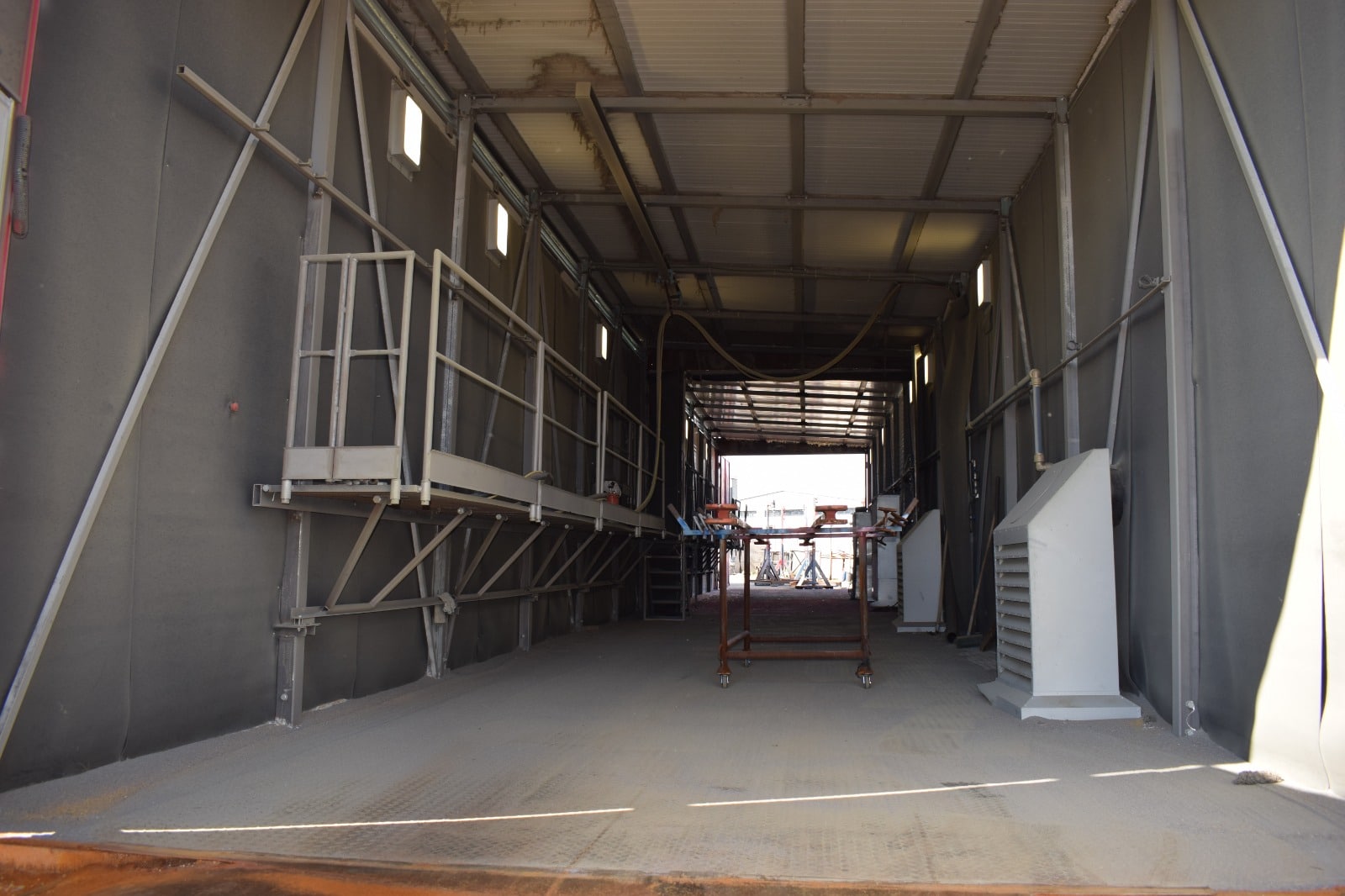 MEVI has developed a transportable sandblasting and painting booth. The system was designed and built in such a way that it can be disassembled in 4 hours. In addition, the plant is equipped with devices useful for managing the internal crane during the sandblasting and painting phase.